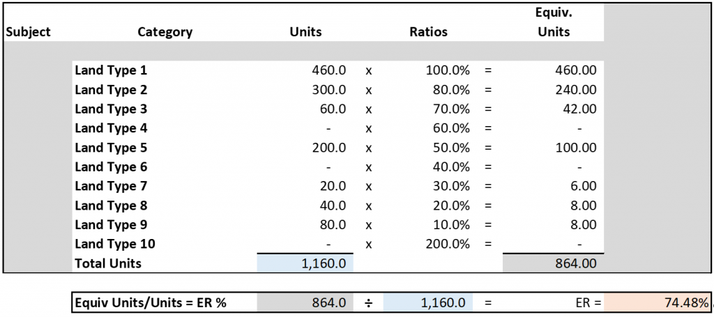 The ER replaces the ASFMRA’s traditional “land-mix” procedure that contained multiple computations. The process converts the “land contribution” within each sale to a mathematical percentage, an expression of the “whole”. To begin, subject ratios are required to express its mathematic composition (74.48% below). Then, one (1) unimproved and one (1) improved sale were reduced to the same mathematical “expression” or Equivalency Ratio to ultimately compute the “land-mix” adjustment for each.