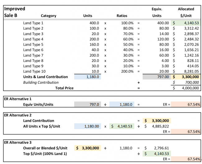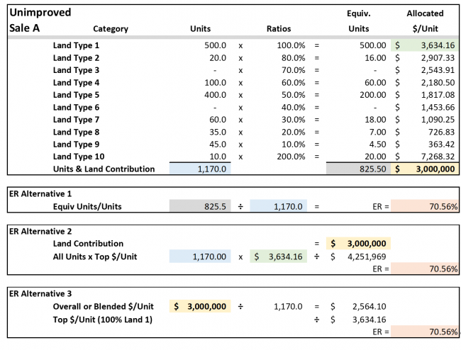When this process is repeated for each sale, the percent change between the sales and subject provide the basis for a simple calculation for the differences in “land-mix” or composition disparities. Two sales are shown below, i.e., one unimproved and one improved; plus, three (3) ways to compute the Sale ER’s.