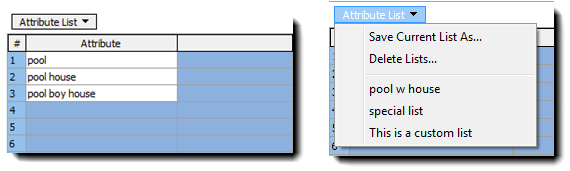 An Attribute List is created in the same manner as a Land List. When the expanded improvement page is chosen, the Attribute List is empty. Enter the attributes for the improvement in the appropriate cells. To save the list for future use, click the drop-down arrow and choose Add — then name the list. The point is to sync all potential subject’s and improvement lists for this property type so that one “macro-list” covers all attributes for each specific group.