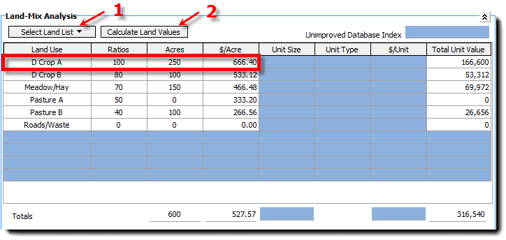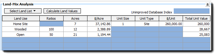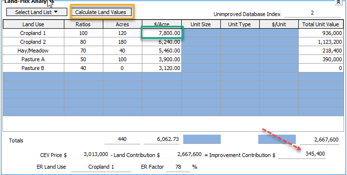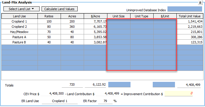 - UNIMPROVED SALE: Input the number of acres for each of the land types; then click Calculate Land Values. The $/Acre and Total Unit Value columns fill with data. The final $/Acre reflects the land/mix ratios for the list used. A price per acre ("$/Acre") contribution for each of the land types is needed, even though the sale may not include all land types. This is important because the subject may have land types that the sale does not. The land/mix ratios should be reviewed and adjusted periodically to match market conditions. Using land lists ensures consistent data entry, and critical for the software calculations to work properly.