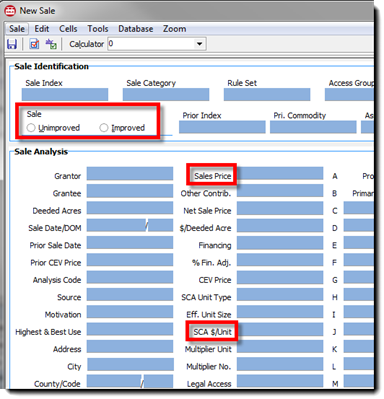 In the Sale Analysis area of the new sale check Improved/Unimproved as appropriate. Tab through the cells to enter sale data such as grantor, grantee, acres, price, etc. When you enter data into certain cells such as Sales Price, you will see other cells populate automatically, i.e. CEV Price. Be sure to enter the SCA (Sales Comparison Analysis) Unit Type and Effective Unit Size. Acres and Total deeded acres are most common, however, in cases where sales are not driven by acres, other units of measure such as AUMs, board feet, barrels, etc., should be applied. For most cells, a drop-down menu of responses can be created, then R-Click, select, and its entered.