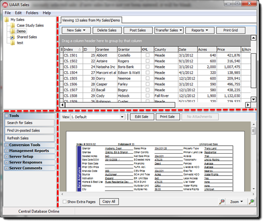 Open DataLog and observe there are four sections in the first image below. The upper left section shows the directory of the "My Sales" folder(s); the lower left is for "Tools". The upper right is the list of the sales in the folder (can be customized by clicking on the very small, multiple ‘bars’ box left of “Index”); or additional folders added. The lower right is "individual sale" viewer window, displaying the current sale selected. If new sales have not yet been entered — this portion of the window will be blank.