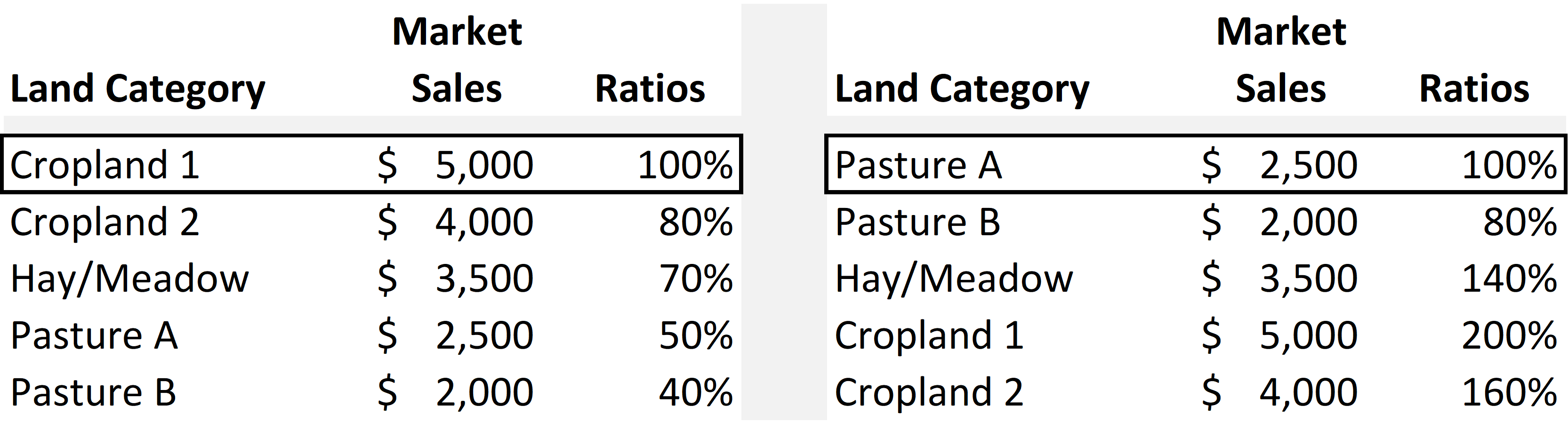For western ranches, the "standard" and most common land type may be "Pasture A". All remaining land types are then expressed with ratios based on Pasture A or that 100% land row (as shown below right).