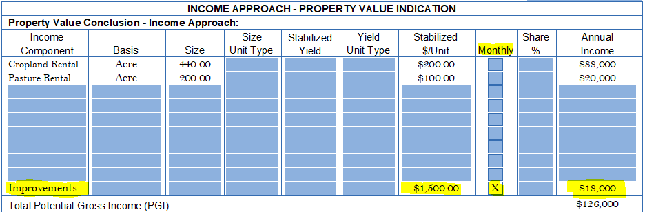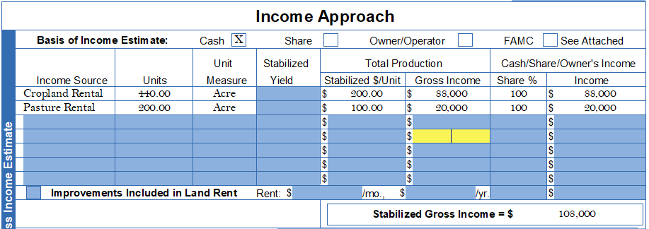 A Cash Rent is used in this example (yellow box). Cropland rent is $200/acre and Pasture rent $100/acre (red box). The “Cash” income portion must sync with the income basis of calculation. The Stabilized Gross Income (cash basis) is totaled at $108,000 by the program.