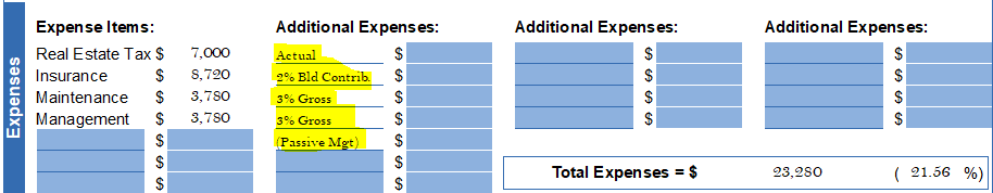 The “Allocate Expenses” box (red arrow below) list expenses like insurance, maintenance, management costs, and taxes. This option performs the mathematical calculations if taxes are entered as $/acre, or the insurance (% of contribution), or percentage for maintenance and maintenance (% of Gross Income). Once the net income for each sale is entered (“actual” or “estimated”), it is divided by the sale price to develop an overall capitalization rate for the income approach.