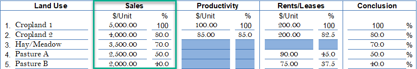 Inferior land types do not have to be arranged from the most to least valuable. AgWare recommends finding the "market standard", i.e., which land type is prevalent in the competitive market. Most weight given to the indications from sales outlined in green. Productivity and Rentals/Leases generally support because some indications were not found in this market. Reconciled results at the end of the process are shown under the "Conclusion" heading (right column). It is noted, some markets show “non-rounded” relationships and those most prevalent should be applied (without rounding to the nearest 5%). Again, AgWare suggests rounding to the nearest 1%, not 5%.