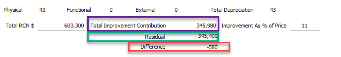 The purple box is the sum of the total contribution of the four buildings at the line shown by the red "dashed" arrow. The goal is to match, as near as reasonably possible, the land residual (green box) at the appraiser’s discretion. When that process produces something less than, say $1,000, plus or minus, the distribution should reflect the appraiser's interpretation of the best allocation. That judgment may change over time as new sales become available, but it merely reflects a reasonable degree of price allocation to each structure.