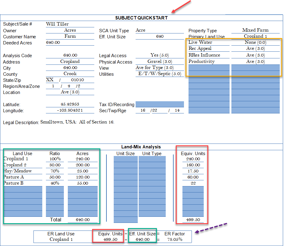 - Land Table and Subject's Ratios (The new ER land mix adjustment process requires Subject Ratios [purple arrow below])