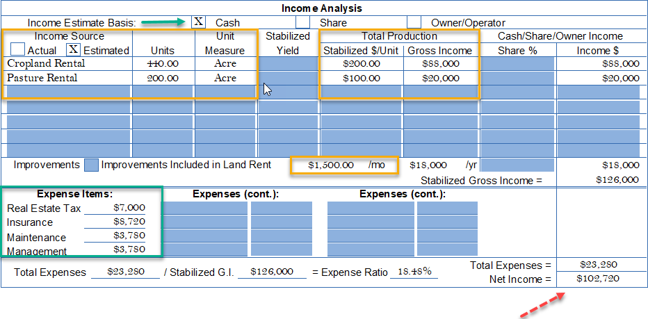 .The gross income and expense information is then added (yellow boxes) by first identifying the "income basis" (cash, share, or owner/operator [green arrow]), and the net income (red arrow) computed at the bottom of this section.