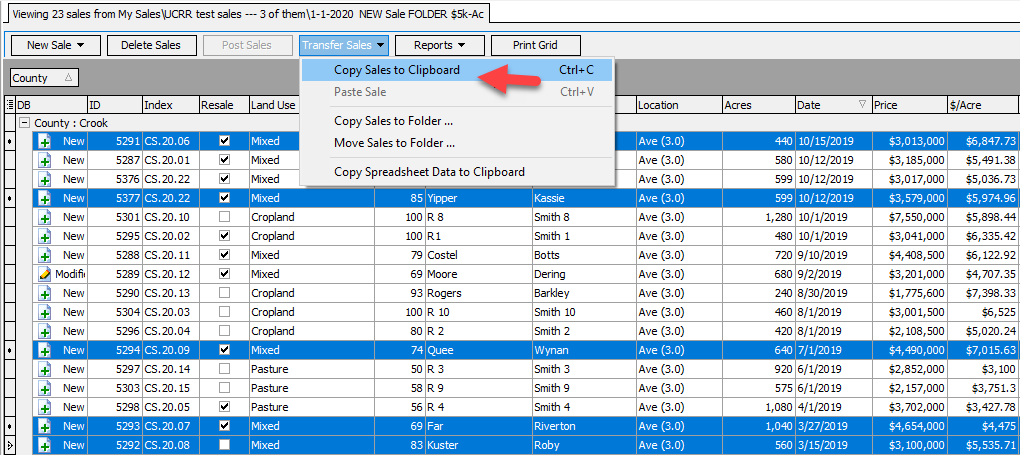 It is important to decide how to organize the sales folders. All users must keep the root folder named My Sales. Users may create sub-folders (counties, property type, etc.) or other "creative" ways to identify records ---- this is not necessary given the sorting ability within DataLog. In fact, it becomes very confusing over time. Sub-folders for new or shared sales (identified by sender's name) is a very good idea. New or shared sales should be reviewed for land-mix synchronization, variable fields and corresponding responses, income method(s) applied, etc.