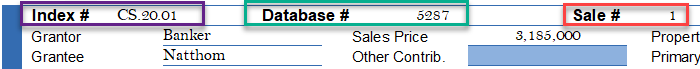 - purple box = index number the user creates for this sale record in DataLog (your creativity can be applied to this number, but remember if the "i" number is used to pull in the sale from DataLog that the resulting impact on its width with the grids, i.e., the longer the enter is --- the more difficult for your reader because the font will be automatically reduced to accommodate the space within each cell
