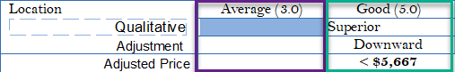 - Qualitative: Enter the "sale's" ranking either superior (purple box below), inferior, or equal on the middle portion of the 3-line adjustment block. Then on the third line (green box) enter the DIRECTION of the adjustment, i.e., downward, upward, or leave "no adjustment" blank or say "equal". Recommendation: when using the "Qualitative" procedure, use the "<", ">" or "=" signs for the final direction the sale suggests where the subject's value is being bracketed. See next graphic below for this third option.