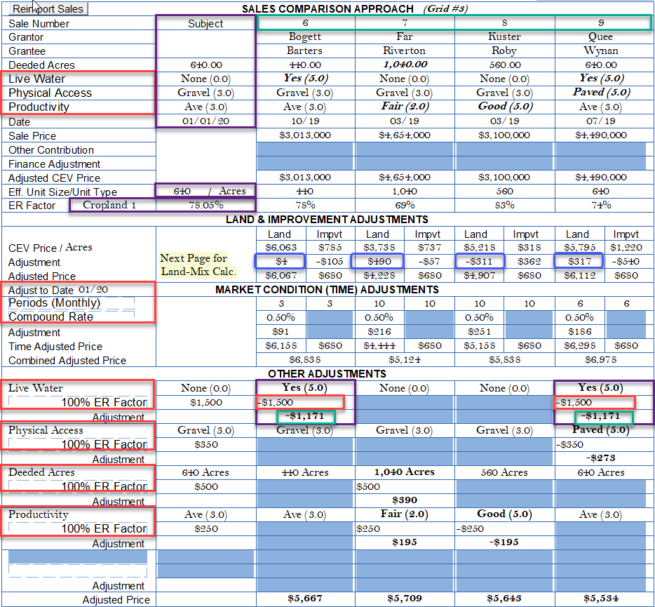 - For the new "ER" method, the land-mix adjustment is a "one-line" or single calculation illustrated by the "blue oval" across the Grid in the "LAND & IMPROVEMENT ADJUSTMENTS" section based on the percent change (not percent difference) between the Sale's ER versus the Subject's ER Factors.