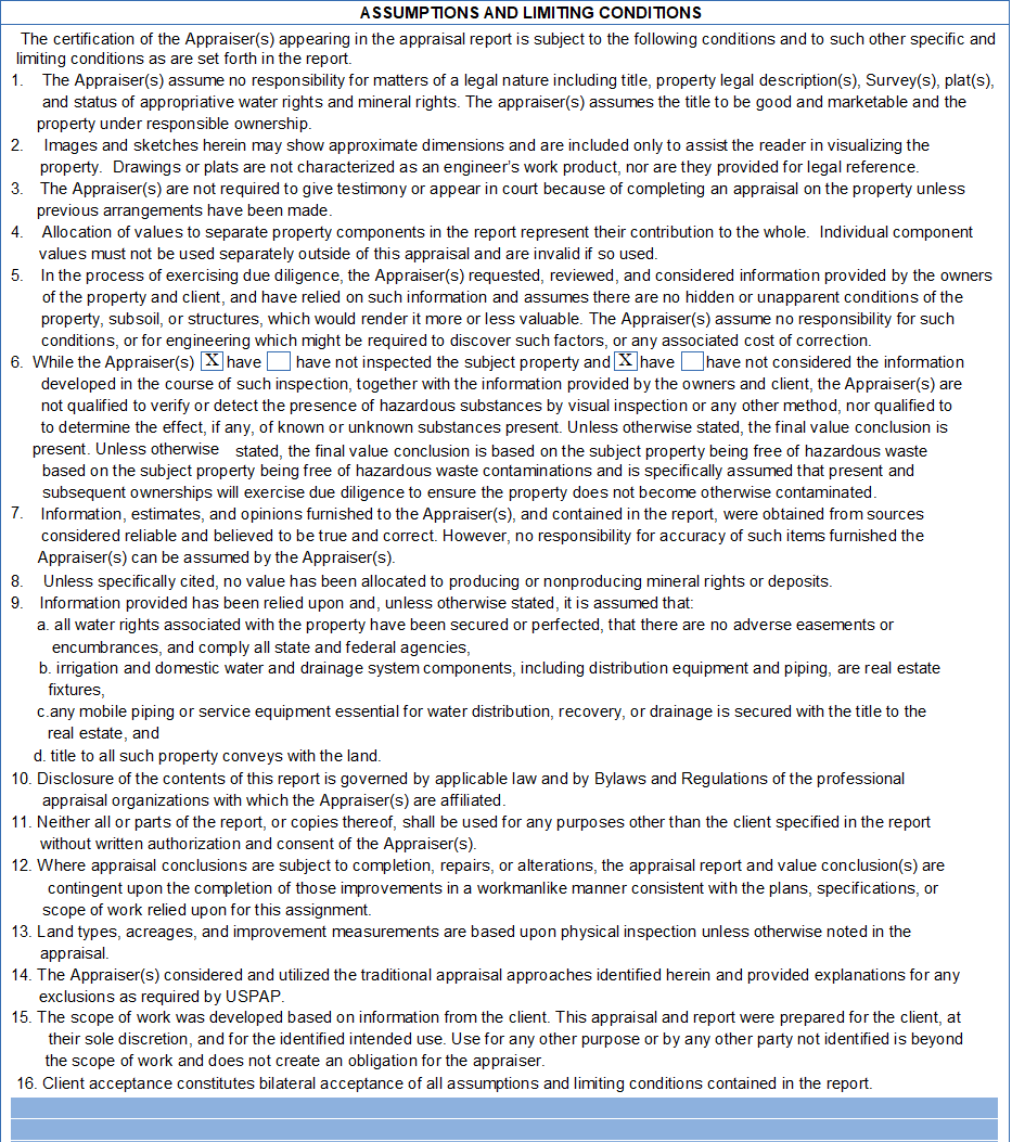 The 2020 forms update includes a revised set of statements within the Assumptions and Limiting Conditions. There is space at the bottom to add specific assumptions or limiting conditions which may be required in the assignment or property type valued. Most of the general content remains, but verbiage changed slightly.