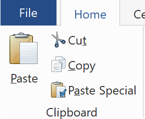 The clipboard section of the Home tab has the standard Cut, Copy and Paste as well as a Paste Special.