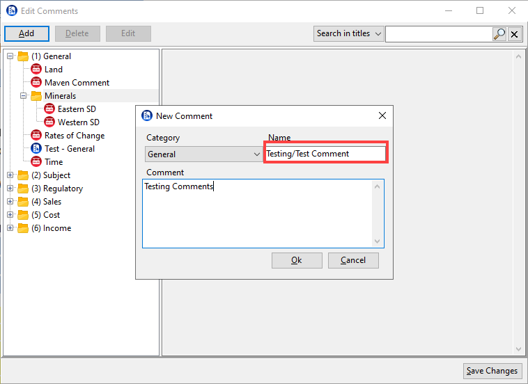 To add a custom folder, click Edit comments and click Add. Select the category for the comment and in the name field type YourCustomFolderName/CustomComment. Then add the comment before clicking Ok. The text before the / is the folder name and the text after the / is the comment name.