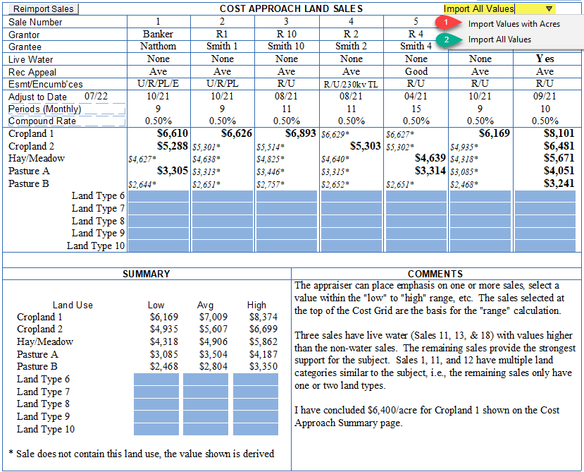 This page displays up to 14 land sales (2 blocks of 7 sales). There is an “action” pick-list in the upper right corner. The user can select “Import All Values”, as shown; or select Red #1 “Import Values with Acres” (does not display calculated values for sales missing 1 or more land types.