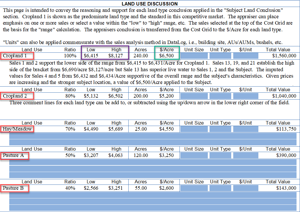The Land-Use Discussion page displays the land type (red boxes) and narrative explanation why a particular value was selected. For "Cropland 1" the purple box shows the "low-high" range and your conclusion from the Cost Grid. Again, the narrative at the bottom of each land type is for your reasoning on why $6,500/acre for Cropland 1 was selected.