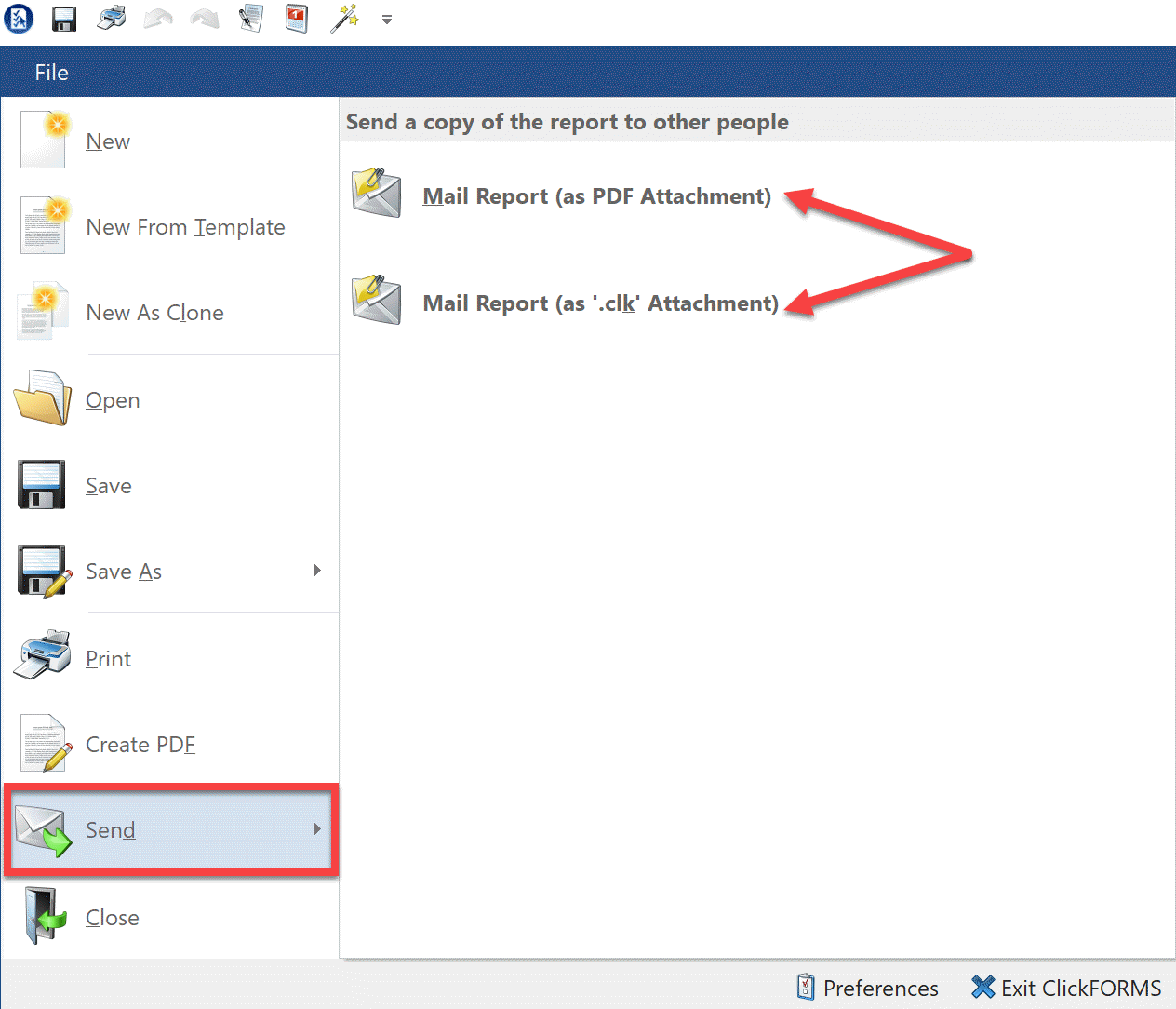 Email a ClickForms Report To email a ClickForms report, click on the File tab (red arrow). Hover over the Send option; there are two options (red arrows below): send as a non editable PDF attachment or an editable .clkx attachment.