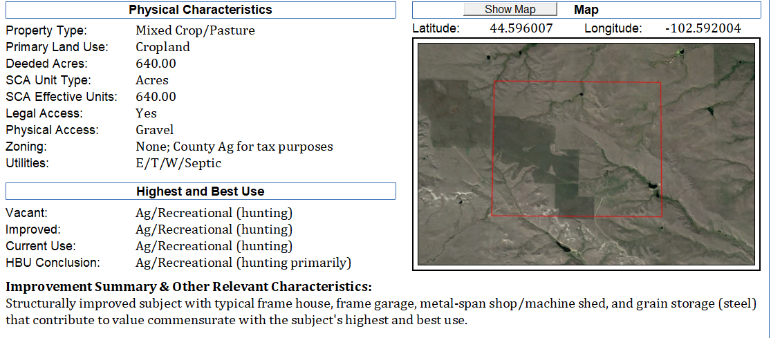 2. The second and third sections include the physical characteristics, including geo-coded location and map; plus, the highest and best use conclusions and a "manual entry" section for "Improvement Summary & Other Relevant Characteristics".