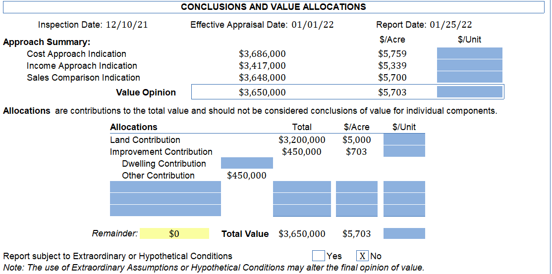 3. The last section is completely "auto-filled" and contains the required dates, value allocations, and acknowledgment of the "Extraordinary or Hypothetical Conditions".