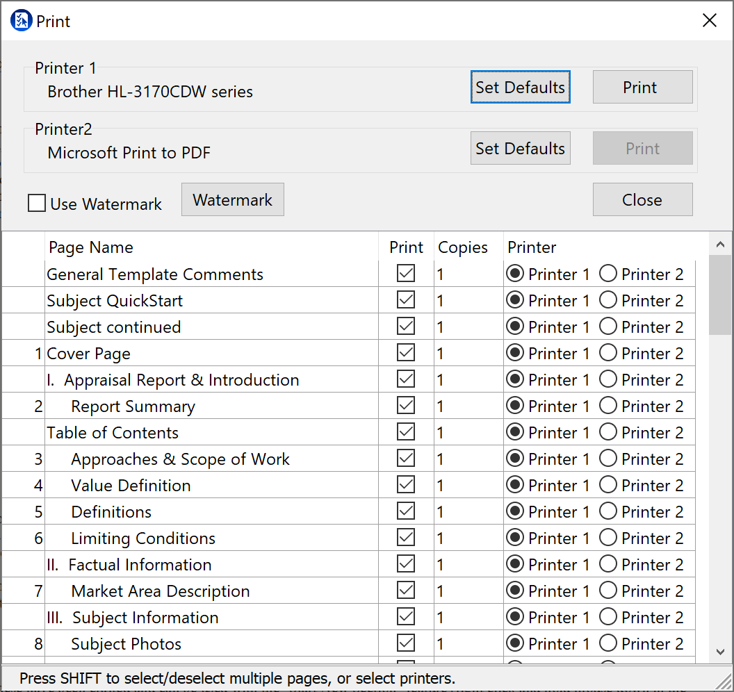 LayoutFile File - Print Print opens a dialog allowing you to set up to 2 printers and you can uncheck pages that you don't want to print.