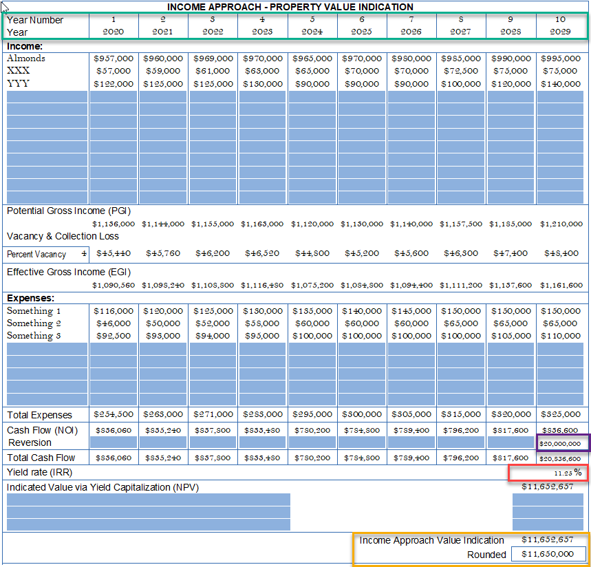A 10-year income (years in green), expense, and reversion (in 10th Year) shown. Five (5) or seven (7) years could be used; if that is opted, only show the desired year’s income and expense, and move the reversion to the LAST year used --- or the year after, if that’s how it was extracted from sales.