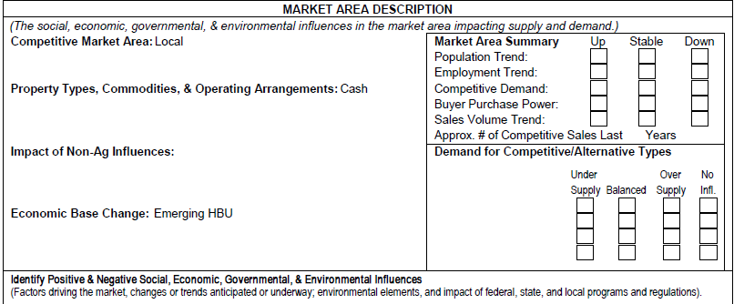 - Impact of Non-Ag Influences - user describes the levels of competition or other uses beside agriculture in the market area. Are those influences expanding, concentrated in one area, or have no impact.