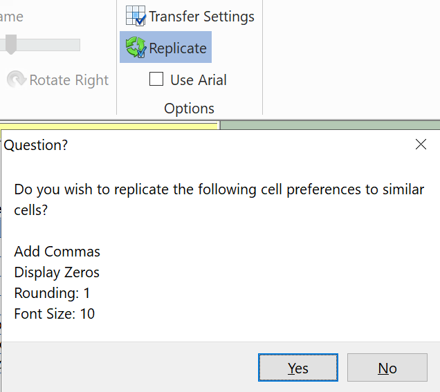 This option is based on cursor location. To replicate the three preferences/settings (shown in the Replicate window) to similar cells throughout a report, click the Yes button.
