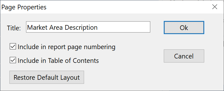 The Page Properties action window allows the user to select which pages will be included in the Table of Contents, and which will be included in the page numbering. Selected pages can be easily retitled.