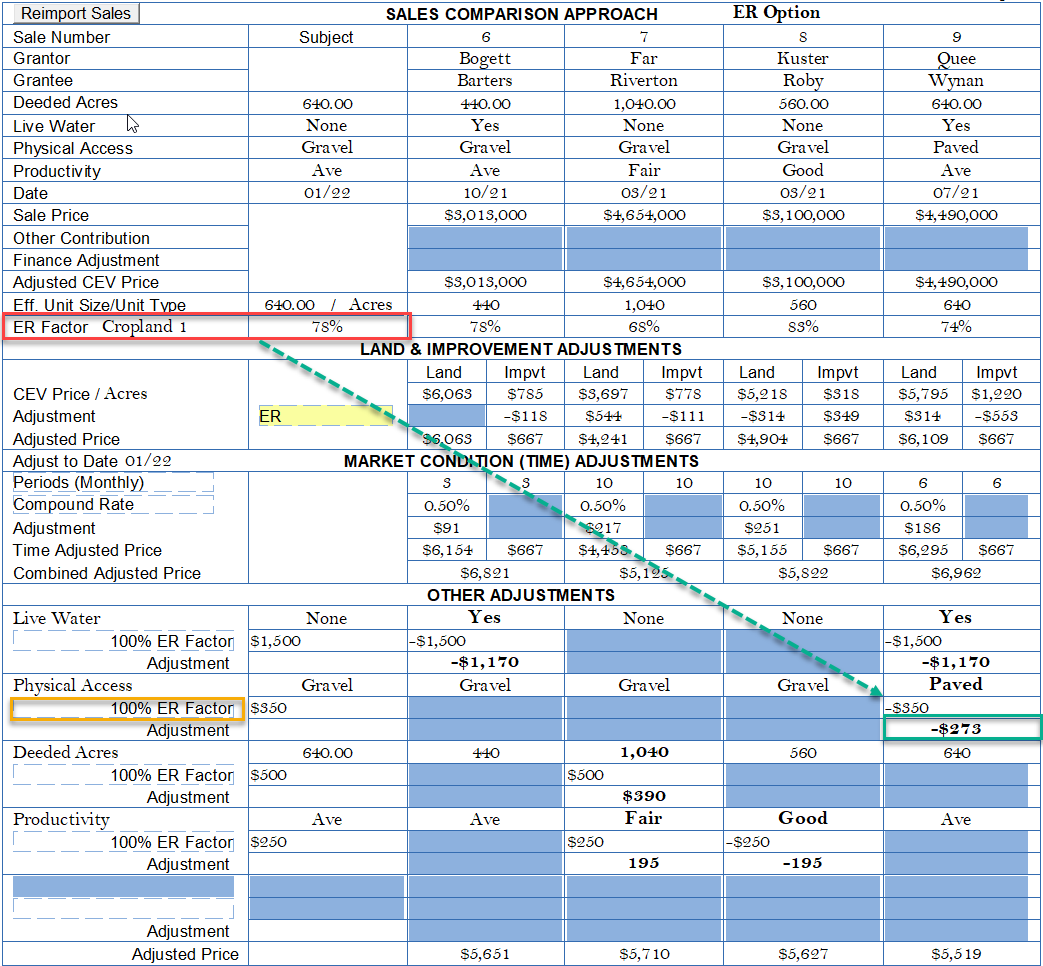 Note the " * " asterisk besides $/Acre Difference * ----After the second pairing for When selected 100% ER Factor in the SCA Grid, the subject's ER is multiplied by the $/Acre difference. The example below shows the Subject ER of 78% (red box) is multiplied by the $350/acre measured difference for an ER calibrated adjustment of -$273/acre (green box below).