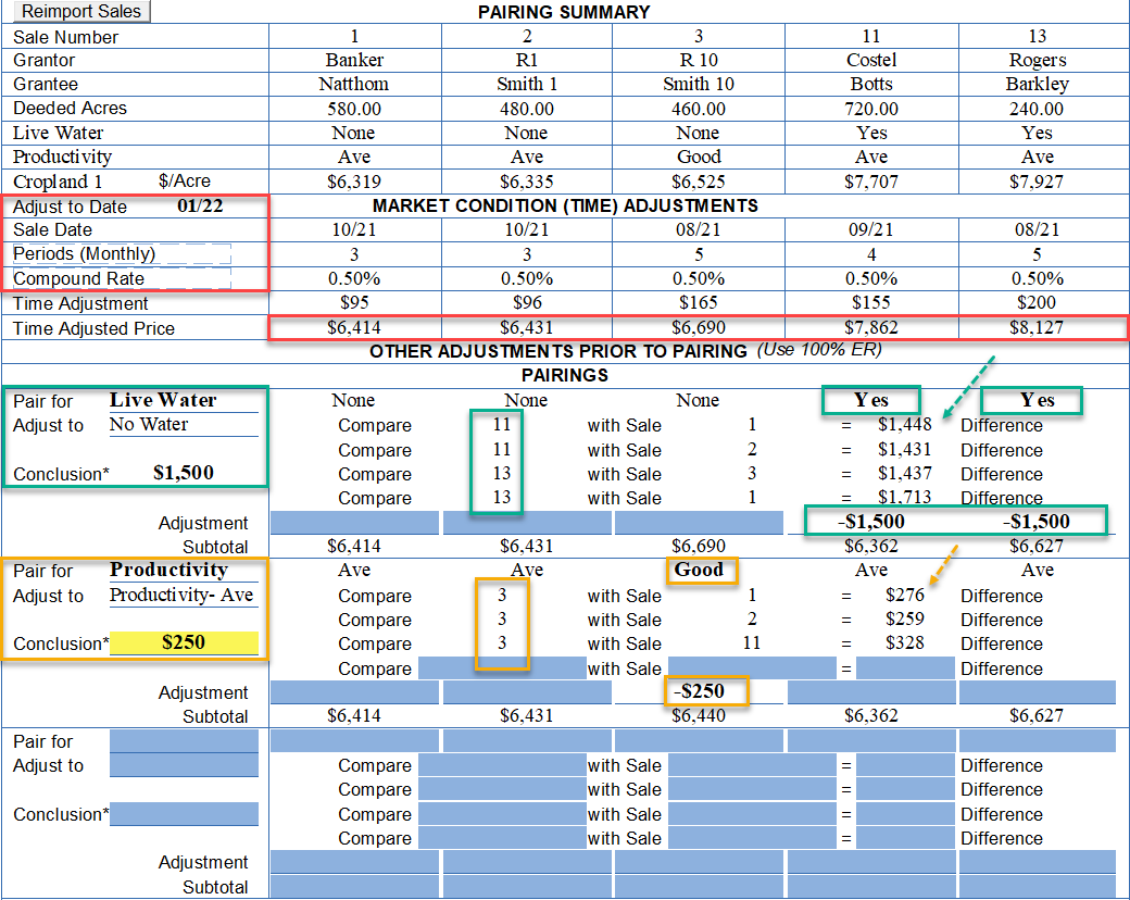 From that point, Sales 11 and 13 with live water become the basis for the first feature pairing. Sales 11 and 13 (green vertical box) is matched against Sales 1, 2, and 3. The difference of $1,500/acre is concluded and applied to Sales 11 and 13 to take them down to the "non-water" status of the subject and remaining sales. After that adjustment in green, all sales are like the subject with regard to time and live water.