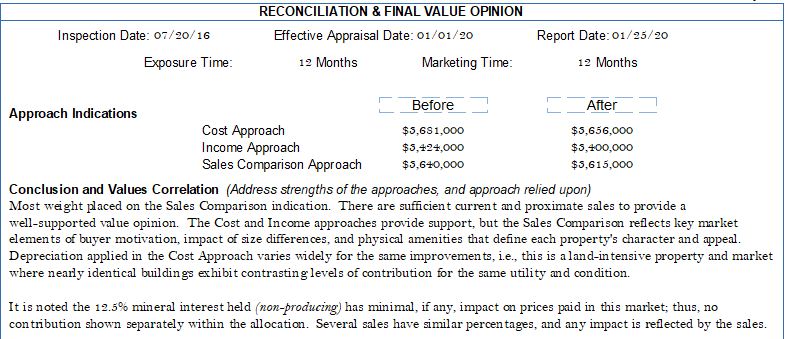 This "dual" property reporting option is also relatively straight-forward. The information displayed conforms to USPAP with dates, exposure/marketing time, preliminary approach indications, the final value conclusion, allocation if appropriate, and affirmative statement about extraordinary assumptions or hypothetical conditions.