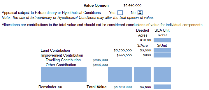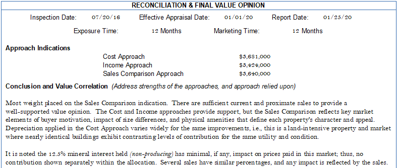 The "single" property option page is relatively straight-forward. The information displayed conforms to USPAP with dates, exposure/marketing time, preliminary approach indications, the final value conclusion, allocation if appropriate, and affirmative statement about extraordinary assumptions or hypothetical conditions.