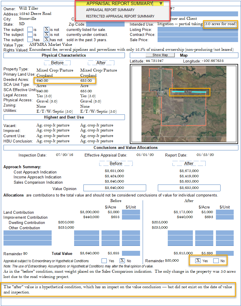 The 5-acre taking for the road widening project reduces the property size. The simple example only shows how the "dual" property situation can be displayed on a single report summary page.