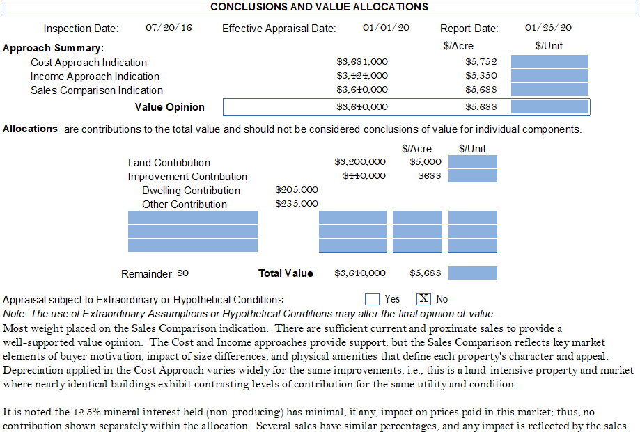3. The third section contains dates, preliminary value indications from the approaches, the final value opinion, and its allocation between property components, if applicable.