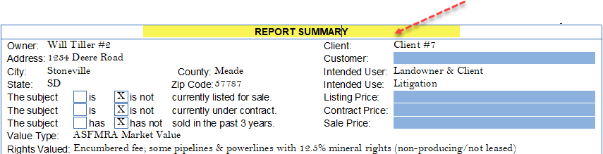 There are now two (2) Report Summary options, i.e., single and dual property --- and the same form can be used for a typical "appraisal report summary", or heading changed for "restricted report summary" --- or any name you desire. The same information is generally required with each report type, but USPAP requires the user to identify the "Report Type" (see example below).
