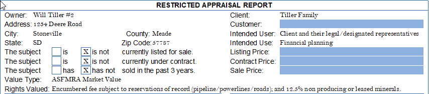 The "single" report option is directed to one situation, i.e., valuing a property for one situation. The majority of the entries associated with the upper portion of this forms synchronizes with the Subject QuickStart page and DataLog. AgWare provides software to a wide gamut of users, some for lending/financing and those in the private sector for even wider application. Thus, "owner", "client", and "customer" is intended to bridge the entire use spectrum. If for your use, one or more of those fields are blank --- that may be more of the normal.