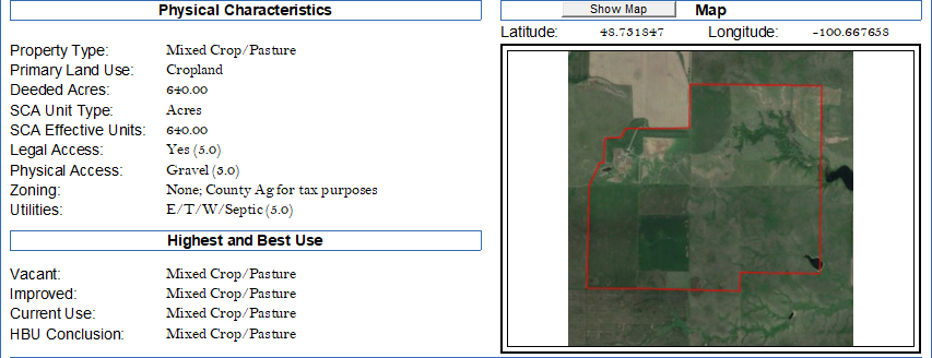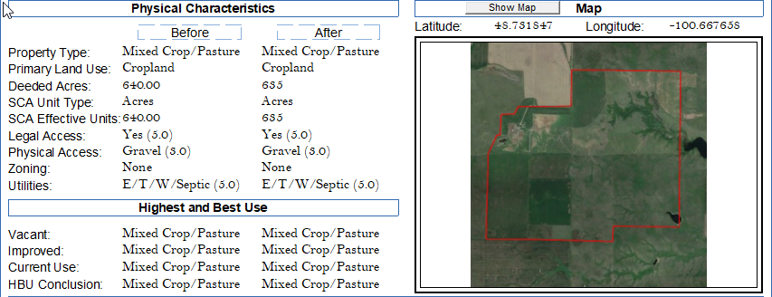 Approach Summary: this information auto-fills from the approach pages and reconciliation. The second phase of the conclusion is also calculated shown the results as $/acre unless the SCA Unit is NOT acres. Example: if "bushels" are the unit of comparison, the results and conclusion are also shown as $/unit in addition to $/acre. When "acres" are used, the $/unit column will not print or PDF.