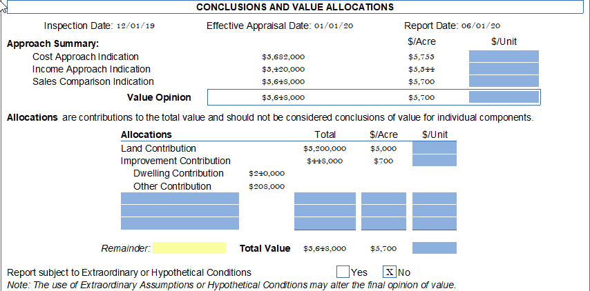 The lower portion of this page contains the valuer's conclusions, allocation(s), and affirmative statement of extraordinary assumptions and hypothetical condition (check-boxes).