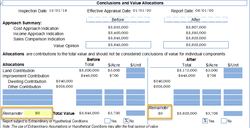 NOTE: The Report Summary and Reconciliation pages both have calculators (yellow boxes) to show the sum of the incremental allocations add to the value conclusion for each situation.