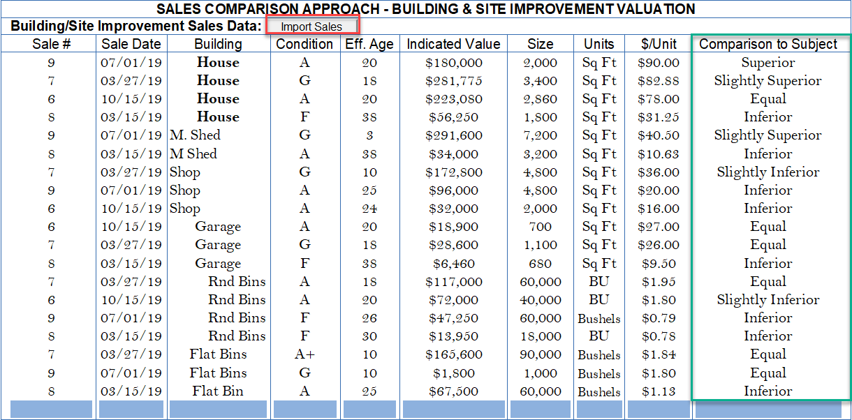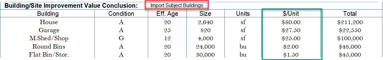 The process hit the "Import Sales" button (red box). That imports the structures from the sales in the report container. Then a qualitative statements made in the last column (green box) to bracket the value of the subject's buildings in this location or specialty structural category.