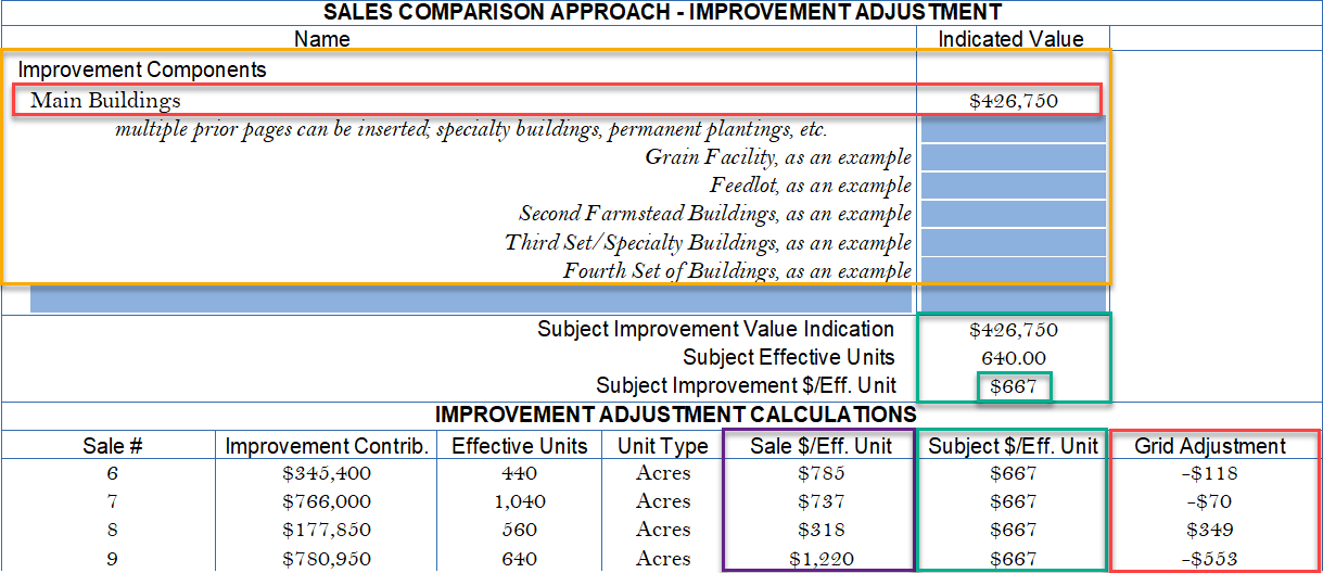 New Forms (2020): With the new ER Land-Mix procedure, the land adjustment is relegated to a single-line and calculation in the SCA Grid. Ag-Ware's solution to address the buildings was to group the improvements showing the structures for four (4) sales on one page (Form 1660 & identified in "Help" as 4-Sale Imp Adj by Sale) labeled as "SCA Improvement Adjustment - MULTIPLE" in the Forms Library.