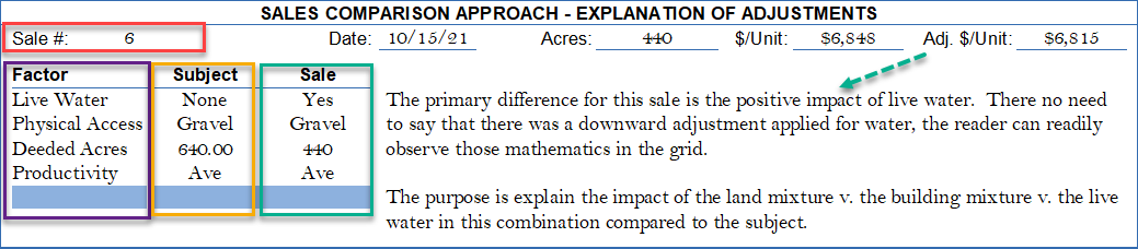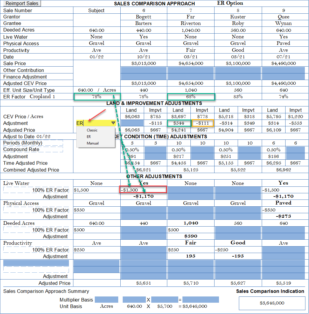 Note the "Other Adjustments" in the bottom of the grid are "measured at 100% from the data analysis or pairing pages" or $1,500/acre, then multiplied by the Subject's ER to calibrate the correct adjustment level for the sale by comparison to the Subject's ER (red box) x 78% = -$1,170/acre