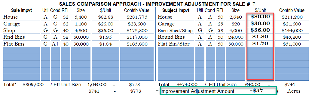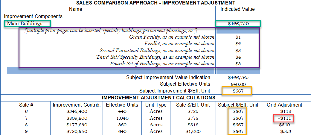 Page 5: Improvement Summary (several Page 3's can be added): Improvements from page 3 at $426,750 shown below. The Subject's improvements are appraised once at $667/acre (yellow boxes). The improvement adjustment for Sale 7 is shown at -$111 (red box) and reported back to the SCA grid.