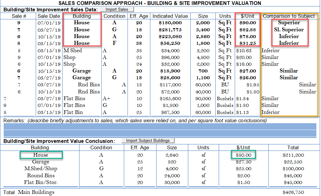 Page 4: Improvement Contributions from Sales ..... Applied to Subject and Summarized on page 5. NOTE: Page 4 can be added multiple times for several building sites, differing building sets (dairy, feedlot, poultry, etc.). Houses grouped together, compared to subject (last column right), and value assigned to Subject's house (green). Improvements summed on this page and reported on Page 5.
