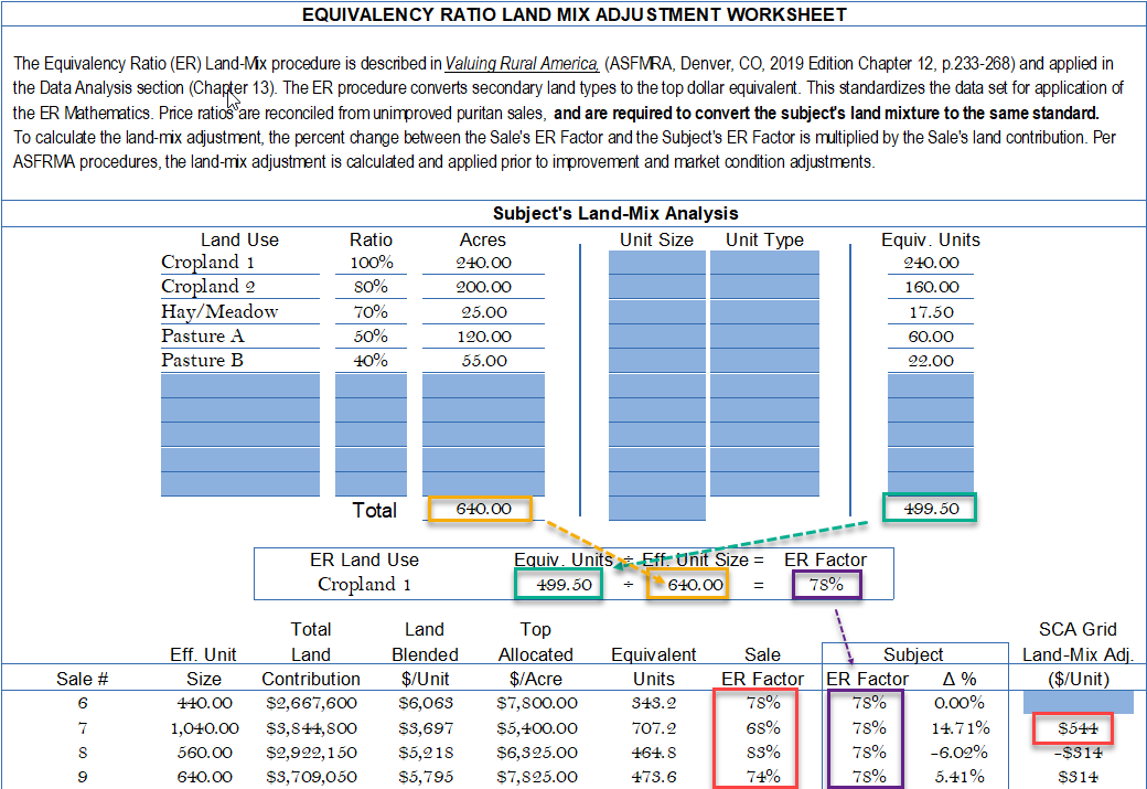 Page 3: ER Land-Mix Worksheet. Subject ER at 78% equal to Sale 6, also at 78%; hence, no adjustment. Sale 7 shows the Sale at 68% versus the Subject 78%. The % change (not percent difference) is calculated at 14.71$ or an adjustment to Sale 7 of $544/acre is reported by to the SCA Grid.