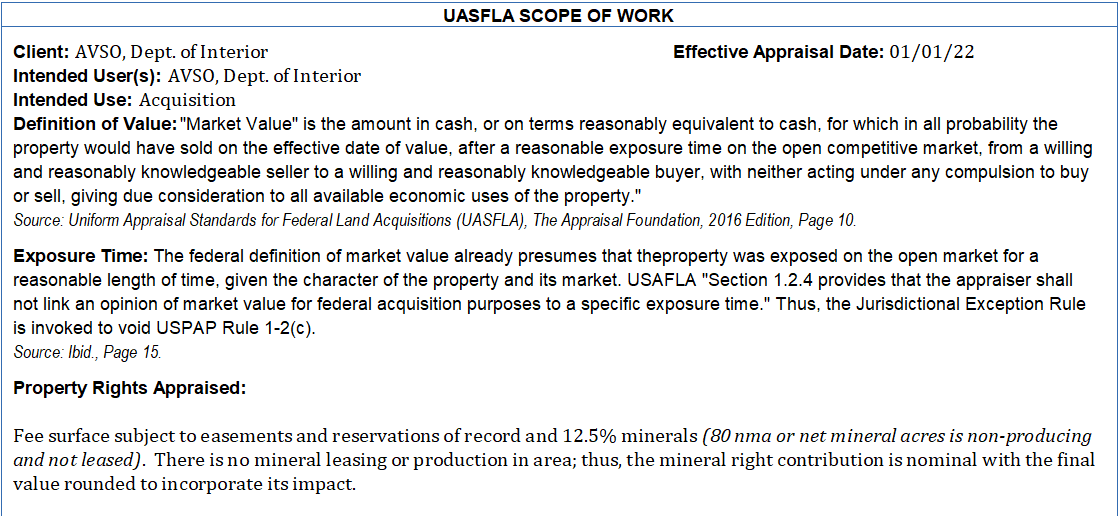 The Scope of Work (SOW) was re-crafted for UASFLA with specific content in this location, federal definition of market value, Jurisdictional Exception for Exposure Time, and Property Rights Appraised.