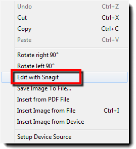 Once the program has been installed and unlocked, and the user R-clicks an image within ClickForms, the menu will show the Edit with Snagit as an available/enabled option.