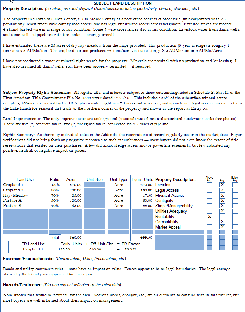 Flexibility is the new norm in ClickForms. While a hard-coded list leads trainees through the process, there can be considerable blank look, blank cells, etc., when properties exhibit higher levels of complexity. The 2020 Subject Land Description page is about 80% narrative allowing the user to craft comments specifically to the physical and economic characteristics that impact the Subject's value in any particular competitive market area. The verbiage below is taken from several non-related appraisals to illustrate what can be addressed that may be a little out of the norm.
